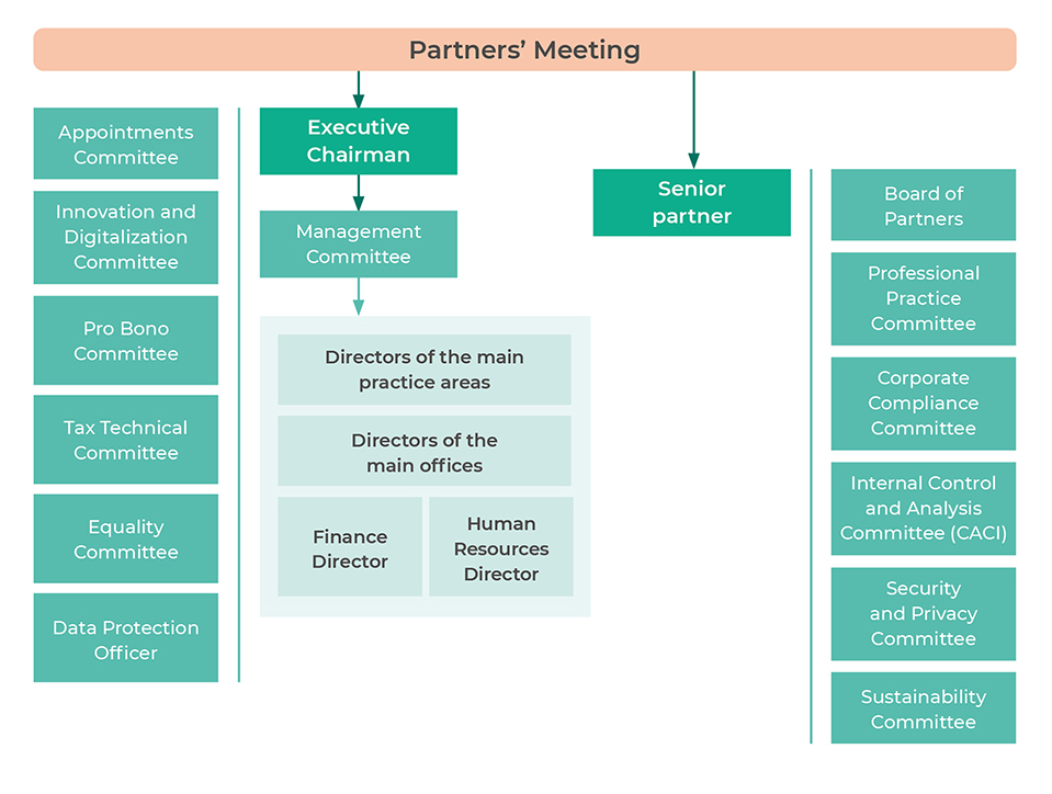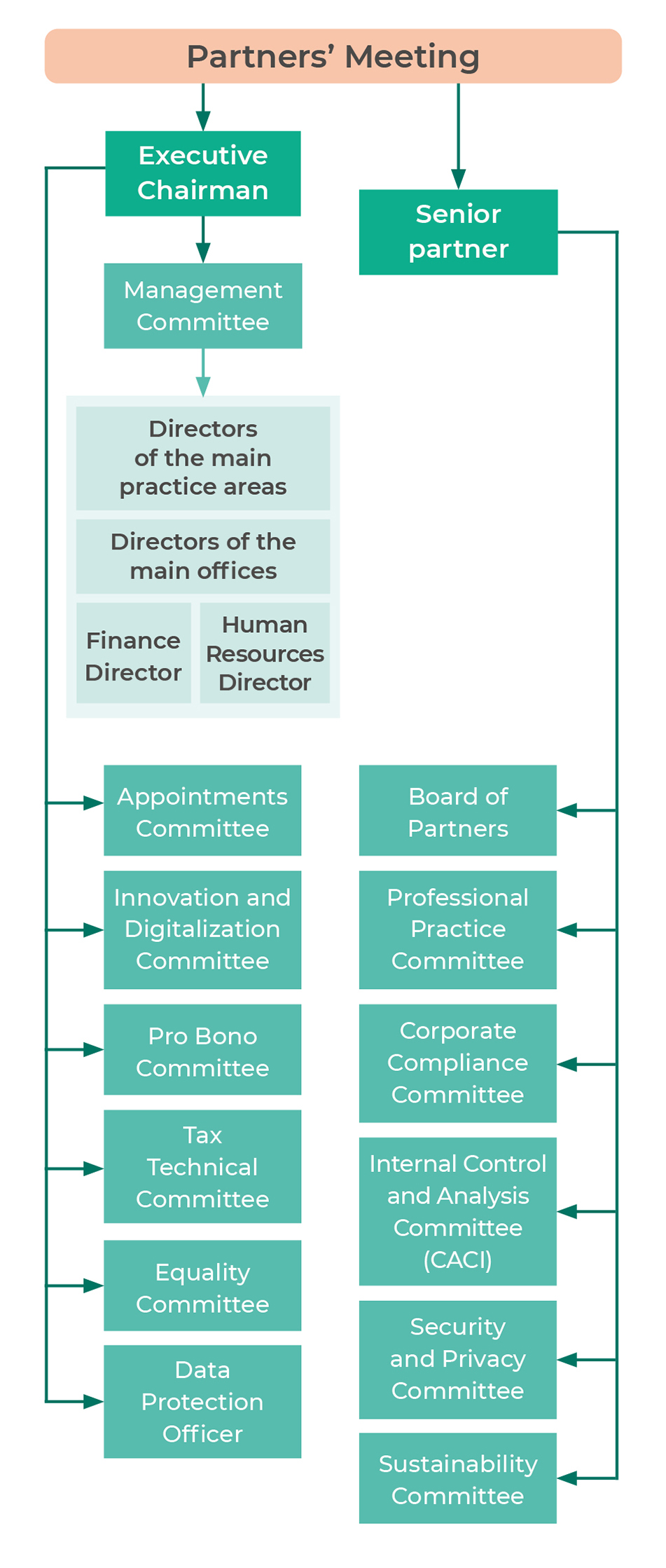 The firm’s senior partner is Rosa Zarza. She is tasked with the following functions, among others: supervising, supporting and reporting to the executive chairman; reporting and submitting proposals on the firm’s corporate governance to the Partners’ Meeting; ensuring correct application of the measures set out in the Corporate Compliance Program and the anti-money laundering policy; managing legal conflicts of interest and safeguarding the firm’s reputation. In carrying out her duties, the senior partner is supported by and chairs the Board of Partners and is assisted by the various advisory committees.