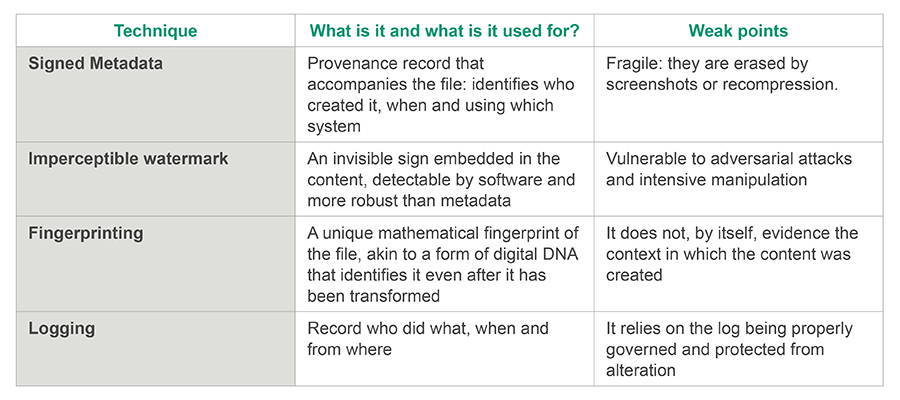 In relation to providers, that is, manufacturers of AI systems, the code proposes a layered marking system that must include, at least, a metadata layer and watermarking with optional fingerprinting and logging. For those who are not familiar with these terms, we explain them below, highlighting their strong and weak points: