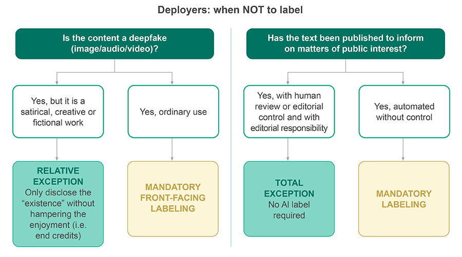 Section two is directed at those who publish or disseminate AI-generated content. For image, audio, or video deepfakes, the disclosure obligation is straightforward: the content must be clearly and distinguishably identified as synthetic. For text relating to matters of public interest, a disclosure obligation is also applicable, unless the content has been subject to human review or editorial control and someone assumes responsibility for its publication.