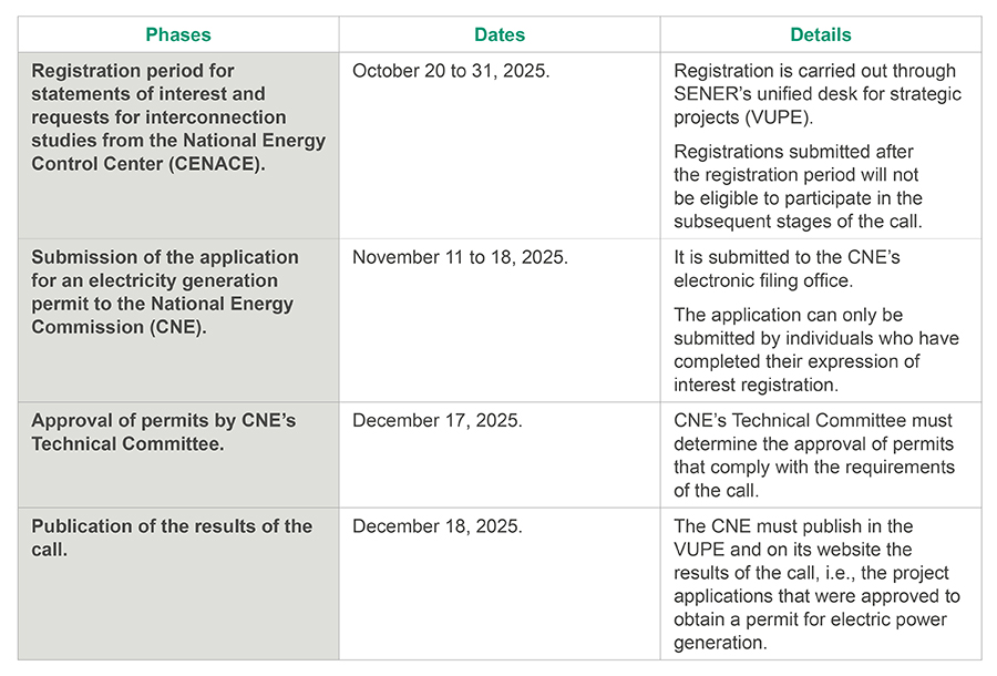 Specifically, paragraph 6 of the call, entitled “Calendar for determining the granting of power generation permits derived from the call” is amended to include the extension of the period for statements of interest by individuals and requests for interconnection studies until October 31, 2025.