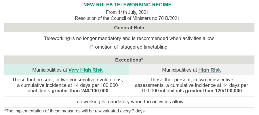 It was published in the Official Gazette the Resolution of the Council of Ministers no 70-B/2021, 4th July, which, among other measures, establishes new rules for teleworking regime, applicable from 14th July, 2021.