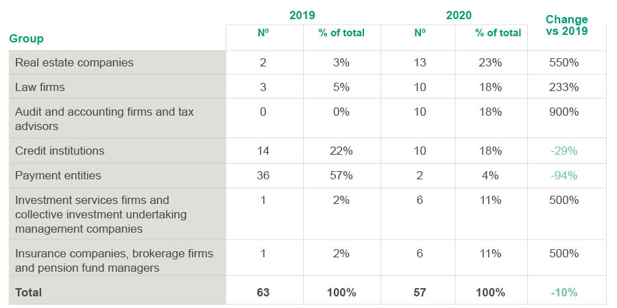 In 2020, Sepblac carried out 13 inspections on real estate companies, 10 inspections on law firms, and conducted 10 more inspections on audit and accounting firms and tax advisors. These figures were considerably higher than the ones of the previous year, reflecting a closer monitoring of anti-money laundering and counter-terrorist financing (AML/CFT) compliance by these operators by the regulatory body. The greater scrutiny placed on this group of obliged entities meant that fewer inspections were conducted on payment entities (87 inspections in the previous two years).
