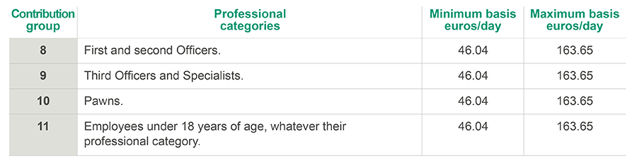 Specifically, the contribution to the General Scheme for common contingencies is limited for each group of professional categories by the following minimum and maximum bases: