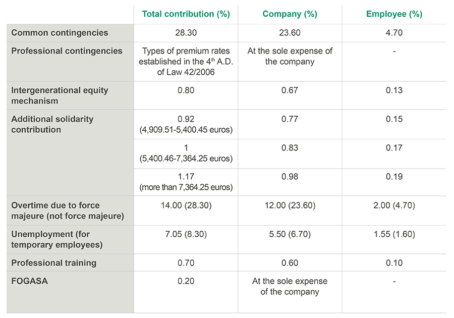 As for the contribution rates for common contingencies for the General Social Security Scheme, the rates applicable to date remain unchanged, with the additional contribution corresponding to the intergenerational equity mechanism being increased to 0.80%, and new elements being introduced, such as the additional solidarity contribution, with three progressive contribution rates depending on remuneration, or regarding situations of multi-employment.