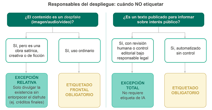 El segundo bloque del sistema se dirige a quienes publican o difunden contenido generado con IA. Para deepfakes de imagen, audio o vídeo, la obligación de divulgación es directa: informar de forma clara y distinguible que el contenido es sintético. Para textos sobre asuntos de interés público, también existe deber de divulgación, salvo que haya existido revisión humana o control editorial y alguien asuma la responsabilidad de la publicación.