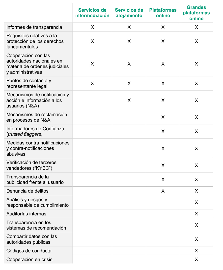 Siguiendo la clasificación elaborada por la propia Comisión, resumimos las nuevas obligaciones cumulativas que pretende introducir el Reglamento de Servicios Digitales para cada tipo de prestador: