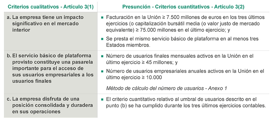 Criterios. Para ser calificada como guardián de acceso una empresa ha de cumplir una serie de criterios cualitativos contenidos en el artículo 3(1) de la DMA. Esto es, si la empresa (a) tiene un impacto significativo en el mercado interior; (b) presta un servicio básico de plataforma que constituye una pasarela importante para el acceso de sus usuarios empresariales a los usuarios finales; y (c) disfruta de una posición consolidada y duradera en sus operaciones.