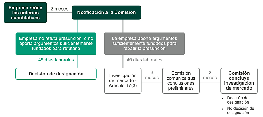 Proceso de designación de los guardianes de acceso. El legislador europeo ha optado por no identificar a las plataformas que cumplirían estos criterios, sino que requiere a las propias empresas que cumplan los requisitos cuantitativos del artículo 3(2) de la DMA que lo notifiquen a la Comisión en un plazo de dos meses. La Comisión, en su caso, las designaría como “guardianes de acceso” sujetos a esta norma en un plazo de 45 días laborales.