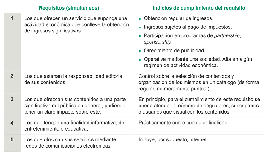 La LGCA establece distintos requisitos en su artículo 3. Fundamentalmente, en lo que nos interesa, se entenderá, por ejemplo, que un vlogger está establecido en España si su sede central se encuentra en nuestro país y las decisiones editoriales sobre el mismo se toman en España.