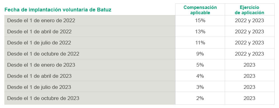 2. Incentivos para la implantación voluntaria de Batuz antes de 1 de enero de 2014: El aplazamiento vendrá acompañado de incentivos fiscales para la adopción previa, de forma voluntaria, del nuevo sistema. Concretamente, se establece una compensación de hasta el 15% en el IRPF o el Impuesto sobre Sociedades para los autónomos, microempresas y PYMEs que implanten voluntariamente Batuz durante los ejercicios 2022 o 2023, que será mayor o menor en función de cuándo se implante el sistema, según el siguiente escalado: