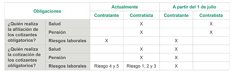 - El contratista persona natural ya no gestionará directamente sus aportes al sistema de seguridad social, sino que la empresa contratante será quien descontará los valores correspondientes de los honorarios y los pagará al sistema de seguridad social.
