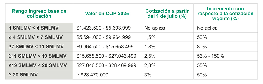 - La reforma establece un aumento del monto de los aportes al Fondo de Solidaridad Pensional (FSP) para quienes tengan un ingreso base de cotización de más de 4 salarios mínimos. El incremento es de entre el 50% y el 150% dependiendo del nivel de cotización.