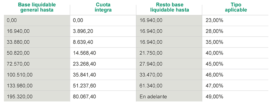 1.- Con efectos desde 1 de enero de 2022, la base liquidable general del IRPF tributará conforme a la siguiente escala de gravamen: