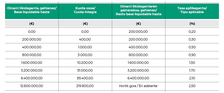 La Norma Foral 2/2018 modifica la escala del impuesto respecto a la que establecía el impuesto sobre la riqueza y las grandes fortunas, dotándola de una mayor progresividad. Así, la nueva tarifa amplía a ocho los tramos de la escala (tres más que los que componían la escala del impuesto derogado) y los tipos impositivos aplicables pasan a ser más progresivos y altos, con tipos marginales que oscilan entre el 0,2% y el 2,5%.