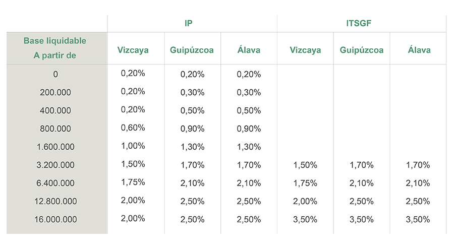- Escala de gravamen: La escala de gravamen se alinea con la correspondiente escala del IP de cada territorio. No obstante, para patrimonios por encima de 16.000.000 euros, se introduce un nuevo tipo marginal del 3,5% (en IP, dicho marginal asciende al 2% en Vizcaya y al 2,5% en Guipúzcoa y Álava).