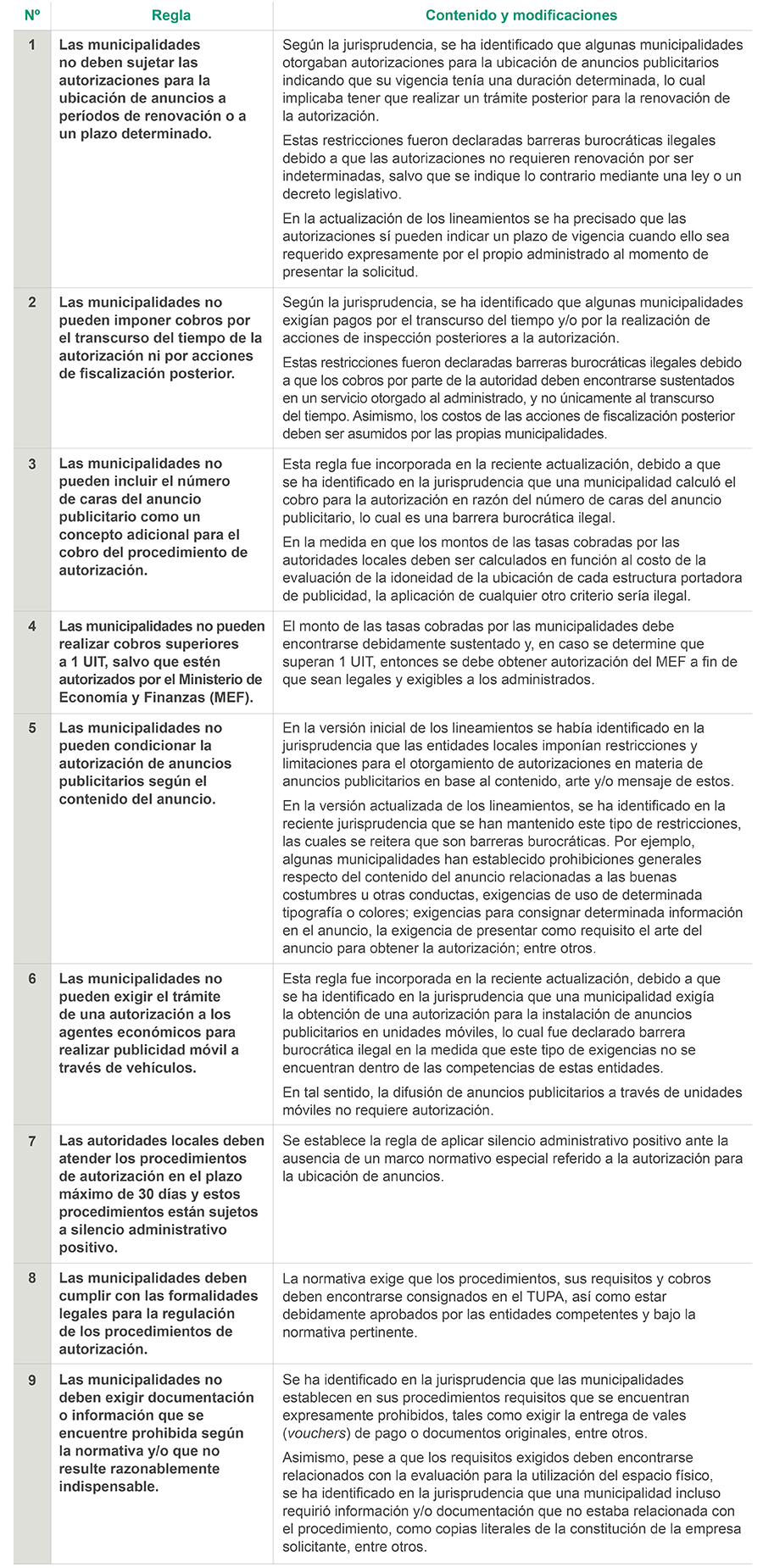 En el año 2015, la Comisión de Eliminación de Barreras Burocráticas del Indecopi (CEB) aprobó los primeros “Lineamientos sobre restricciones en la ubicación de anuncios publicitarios”, de manera que se puedan identificar las medidas impuestas por las autoridades locales que calificarían como barreras burocráticas ilegales y/o carentes de razonabilidad según la jurisprudencia.