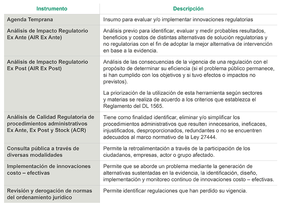 El DL 1565 ratifica varios instrumentos de calidad regulatoria previamente definidos. De manera enunciativa se señalan los siguientes: