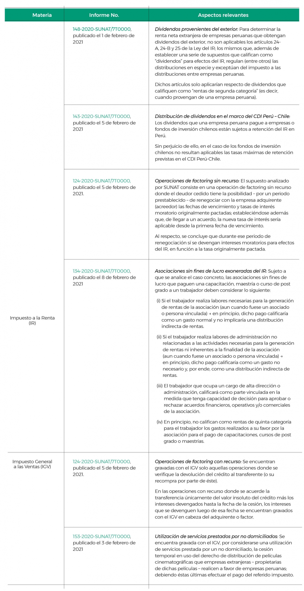La Superintendencia Nacional de Aduanas y de Administración Tributaria (SUNAT) se ha pronunciado respecto de varios temas de interés, incluyendo (entre otros) el tratamiento tributario de los dividendos en el marco del Convenio de Doble Imposición (CDI) entre Perú y Chile y las operaciones de 'factoring' con y sin recurso, mediante diversos informes emitidos a comienzos de febrero.