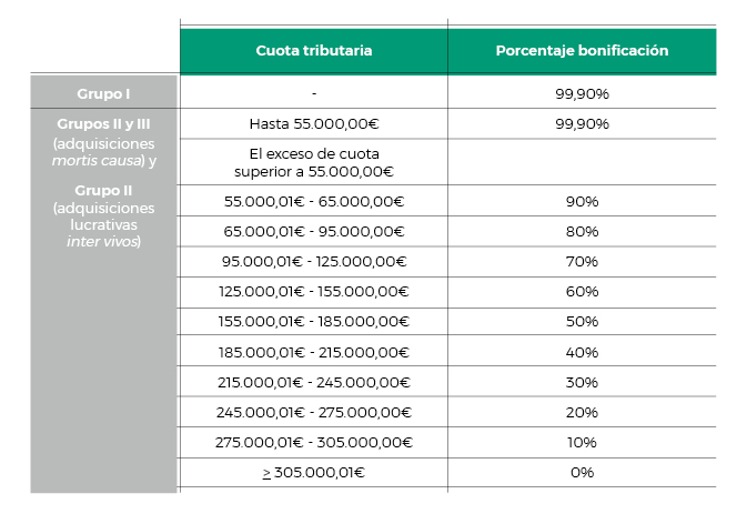 De este modo, los primeros 55.000 euros de cuota tendrán una bonificación del 99,90%, pero este porcentaje se irá reduciendo para la cuota que exceda de dicho importe; cuando la cuota exceda de 305.000 euros solo se bonificará el 99,90% de los primeros 55.000 euros.