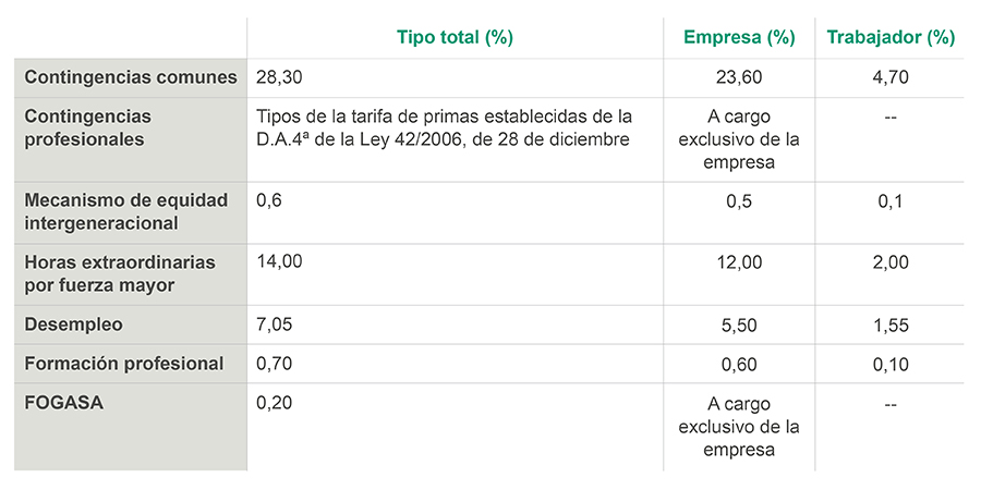 En cuanto a los tipos de cotización por contingencias comunes para el Régimen General de la Seguridad Social, se mantienen los mismos tipos aplicables hasta la fecha y se añade la cotización adicional correspondiente al mecanismo de equidad intergeneracional.