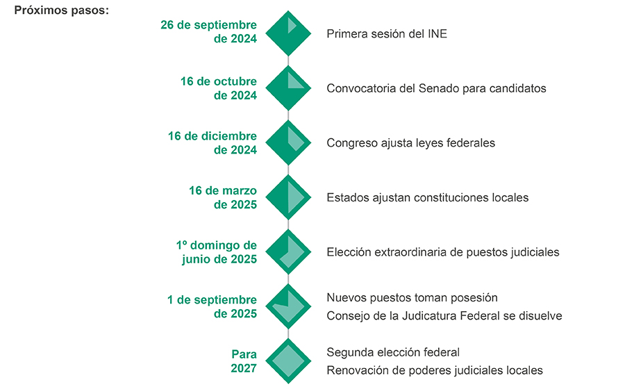 Algunos de los cambios requerirán la promulgación o modificación de leyes secundarias, las cuales deberán ser aprobadas en un plazo de 180 días después de la promulgación de la reforma (incluyendo leyes locales). Las personas que actualmente ocupen los cargos mencionados anteriormente en el momento de la convocatoria del Senado para la elección extraordinaria serán incluidas en las listas para participar en la elección extraordinaria de 2025, a menos que declinen su candidatura antes de que cierre la convocatoria o sean nominadas para un cargo o circuito judicial diferente. Si no son elegidos por el público para un nuevo periodo, concluirán su mandato cuando los nuevos servidores públicos electos tomen posesión, de acuerdo con las disposiciones transitorias del decreto.
