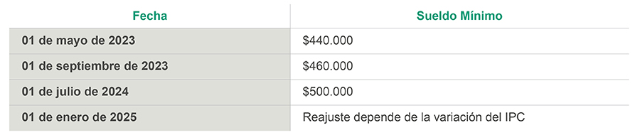 - En relación con los montos indicados en la tabla, es de relevancia destacar que estos valores se encuentran sujetos a cambios del IPC. De manera que de haber una variación acumulada durante el año 2023 que sea superior a 6%, el sueldo mínimo deberá ser aumentado en $10.000 pesos, el 1 de enero del 2024.