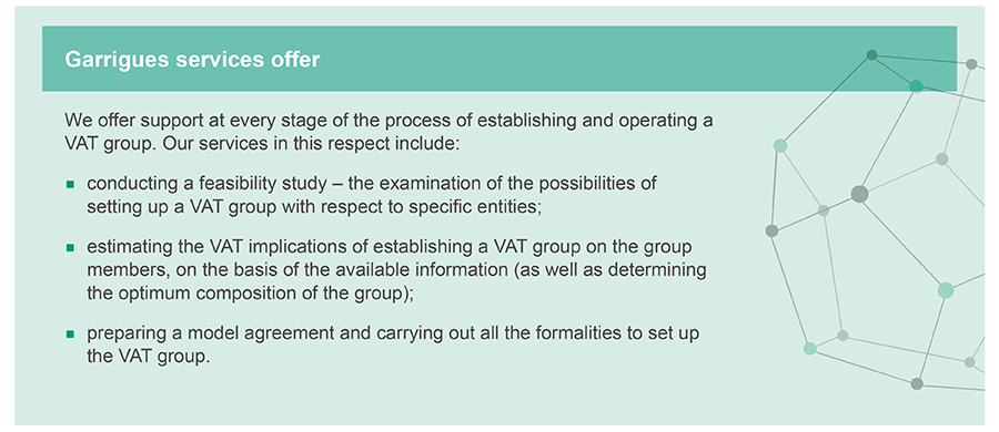 A group, acting through its representative, will be able to file a single, joint VAT return and hold a single bank account for handling VAT refunds and for receiving payments. This will make it possible for group members to have fewer formalities relating to individual accounting for the tax on goods and services, which will improve financial liquidity within the group and reduce the tax risk by limiting the scope of tax audits.