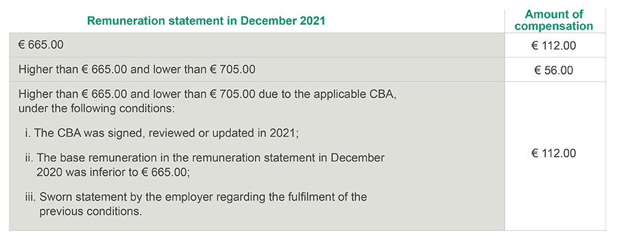 - Having one or more full-time employees with a base remuneration equal to or higher than € 665.00 and lower than € 705.00 in the remuneration statement of December 2021;