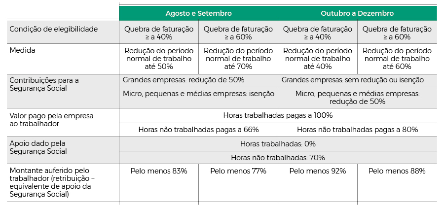 - Condições específicas: durante a aplicação da medida e nos 60 dias subsequentes a empresa (i) não pode proceder a despedimentos coletivos, despedimentos por extinção de posto de trabalho ou despedimentos por inadaptação e (ii) tem de manter o nível de emprego.