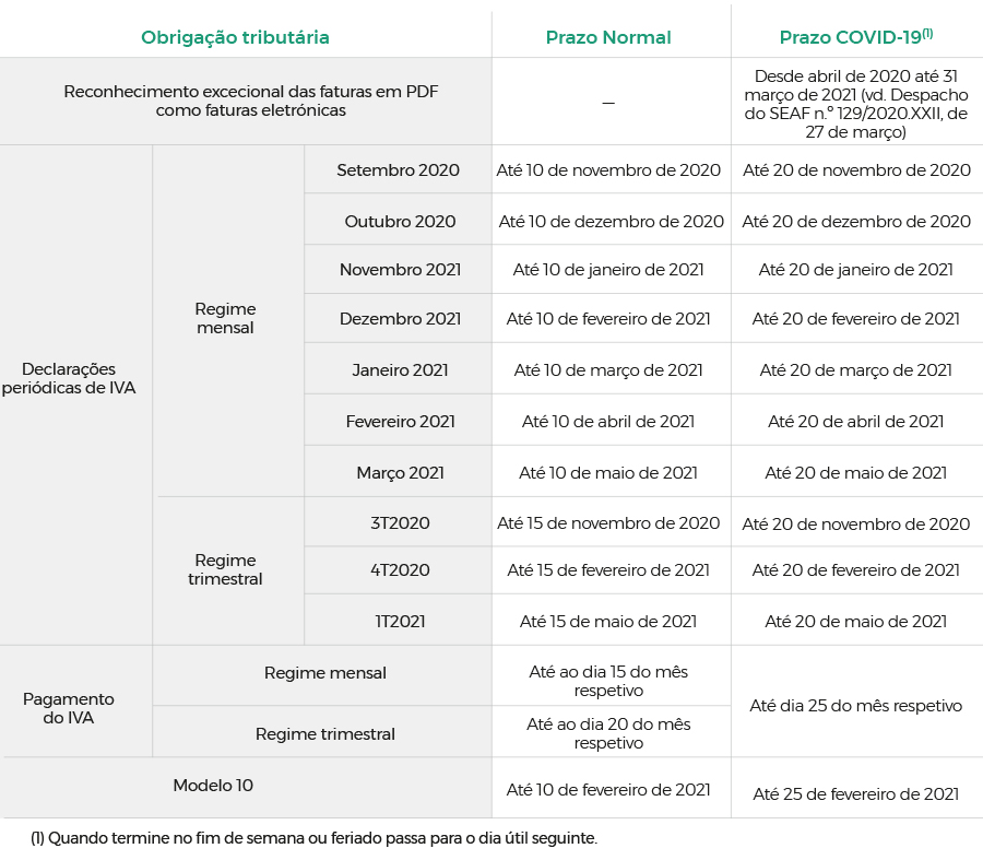 O Governo português aprovou, através do Despacho do SEAF n.º 437/2020.XXII e do Ofício-Circulado n.º 30227/2020, de 10 de novembro, novas extensões de prazos para o cumprimento de diversas obrigações tributárias que resumimos na tabela abaixo e que podem ser cumpridas sem a aplicação de quaisquer penalidades.