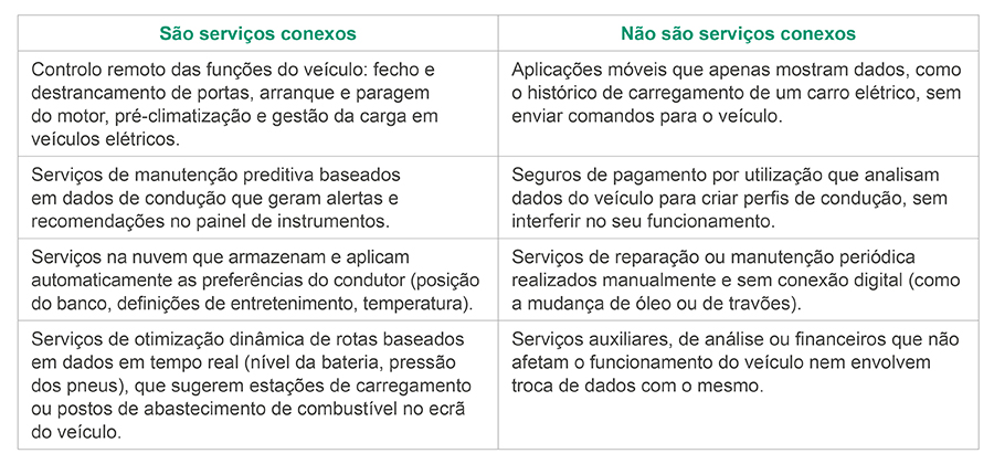 No que respeita aos serviços conexos, embora o guia remeta para o artigo 2.º, n.º 6 do Data Act, especifica também que se trata de serviços digitais (que não sejam comunicações eletrónicas) ligados ao veículo no momento da compra, aluguer ou leasing, ou conectados posteriormente para adicionar, adaptar ou atualizar funcionalidades. A sua característica essencial é que exista uma troca bidirecional de dados com o veículo que afete diretamente o seu funcionamento ou comportamento.