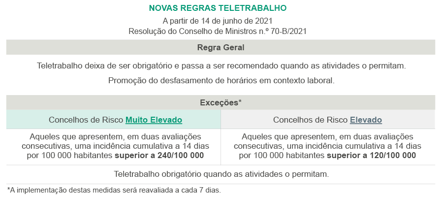 Foi publicada em Diário da República a Resolução do Conselho de Ministros n.º 70-B/2021, de 4 de junho, que, entre outras medidas, estabelece novas regras para o regime de teletrabalho, aplicáveis a partir de 14 de junho de 2021.