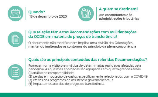 Estas Recomendações, desenvolvidas e aprovadas pelos 137 Estados Membros da OCDE (constituintes do Inclusive Framework on Erosion and Profit Shifting – “BEPS”), visam fornecer tanto às administrações fiscais como aos grupos multinacionais um conjunto de diretrizes que podem ser utilizadas na avaliação e cumprimento das regras dos preços de transferência em períodos afetados pela pandemia.