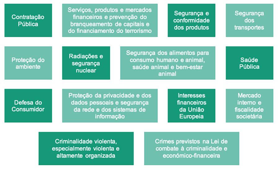 É passível de denúncia qualquer infração que corresponda a um ato ou omissão contrário a normas de Direito da União Europeia, nomeadamente nas seguintes áreas: