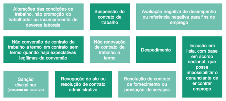 A lei proíbe a prática de atos de retaliação contra o denunciante. Consideram-se atos de retaliação os atos ou omissões, incluindo ameaças e tentativas de atos ou omissões, que, direta ou indiretamente, em contexto profissional e motivado pela denúncia interna, externa ou divulgação pública da infração pelo denunciante, cause ou possa causar a este último, de modo injustificado, danos patrimoniais ou morais.